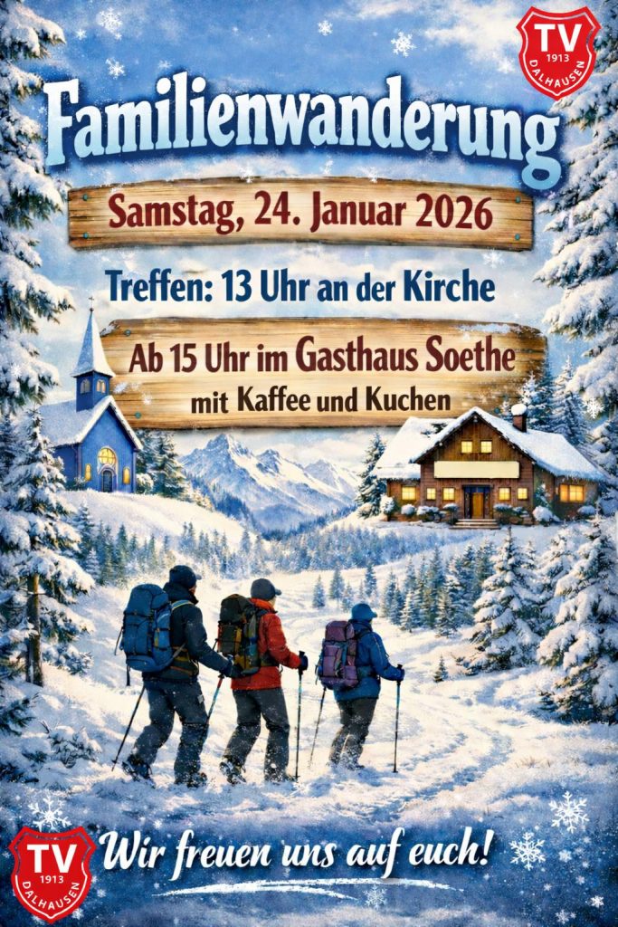 Familienwanderung des TVD am 24.01.26 Januar 9, 2026Januar 9, 2026 admin Kommt mit und seid dabei!!! Vereinsleben